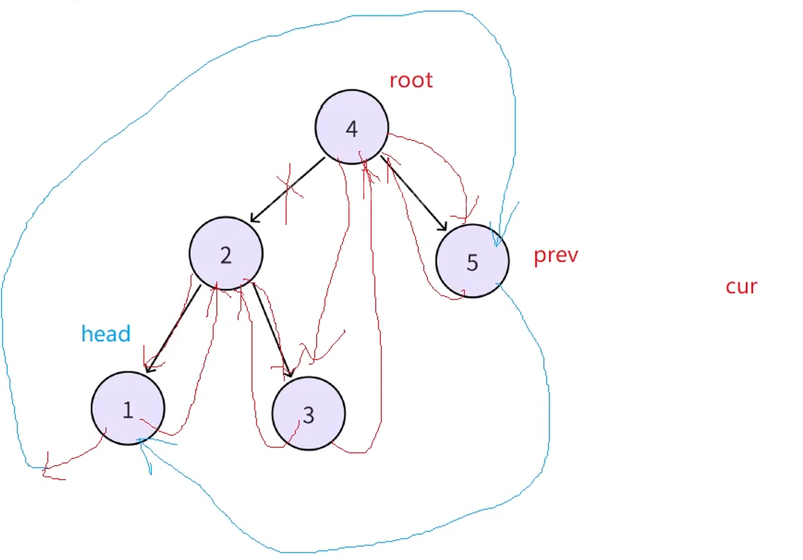 算法思路2:依旧中序遍历搜索二叉树,遍历顺序是有序的,遍历过程中修改左指针为前驱,右指针为后继。记录一个cur和prev,cur为当前中序遍历遍历到的结点,prev为上一个中序遍历的结点,cur->left指向prev,prev->right指向cur。