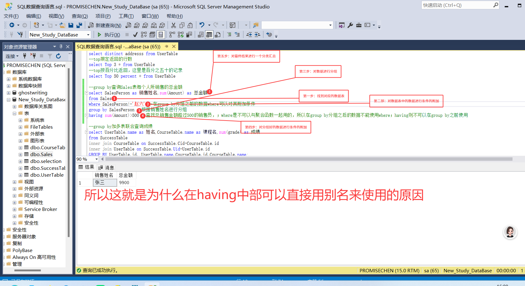 having sum(Amount)>500 --查找总销售金额超过500的销售员,;where是不可以与聚合函数一起用的,所以在group by分组之后的数据不能使用where;having则不可以在group by之前使用