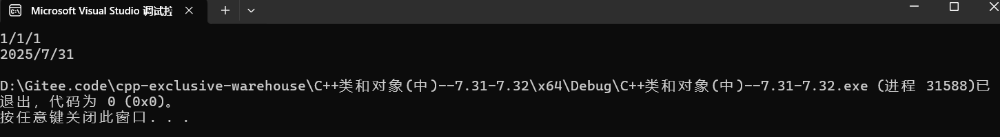 {Date d1; //会自动初始化,调用1或者3,不能同时存在(我上面给3注释掉了,因为2和3也不能同时存在)Date d2(2025, 7, 31);//会调用3,不会有歧义//Date d3();//这种写法是错误的// 参考一下 Data func();你觉得它是对象还是函数呢?//注意:如果通过无参构造函数创建对象时,对象后面不用跟括号。//否则编译器无法区分这里是函数声明还是实例化对象d1.Print();//1,1,1d2.Print();//2025,7,31return 0;