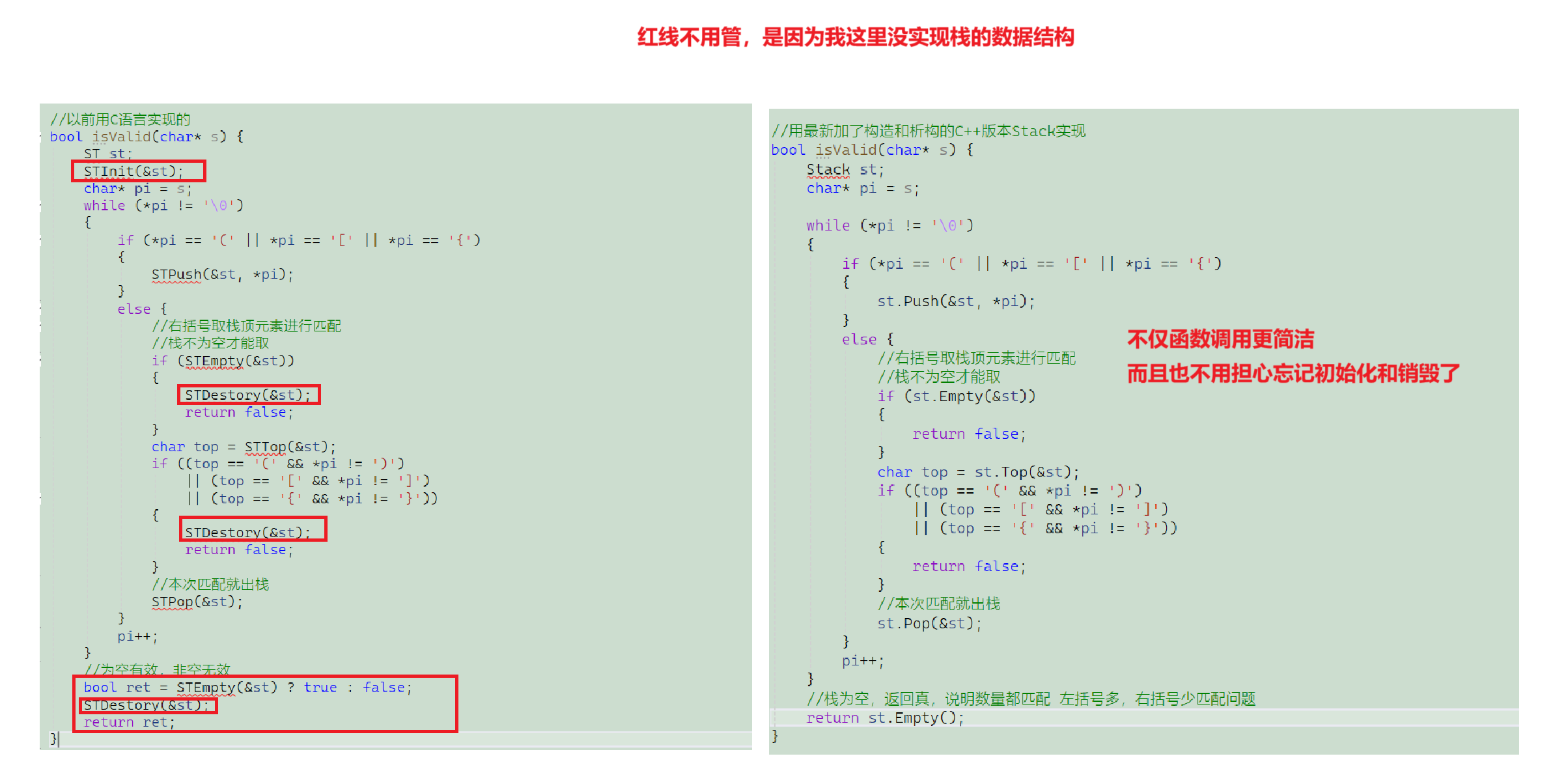 对比一下用C++和C实现的Stack解决之前括号匹配问题isValid,我们会发现有了构造函数和析构函数确实方便了很多,不会再忘记调用Init和Destory函数了(下面的两个实现都需要借用一下栈这个数据结构先,我这里就不展现出来了)。