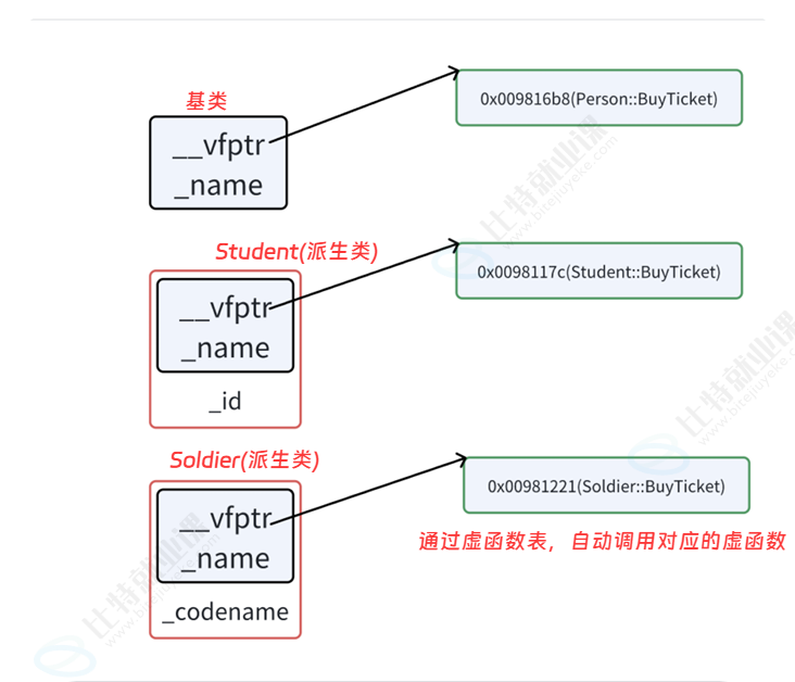 - 派生类中重写的基类的虚函数,派生类的虚函数表中对应的虚函数就会被覆盖成派生类重写的虚函数地址。