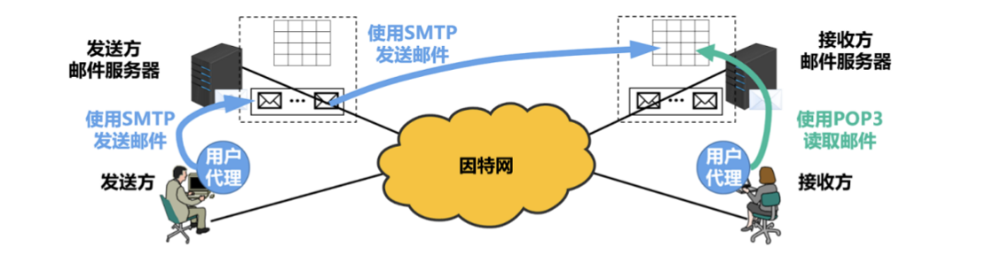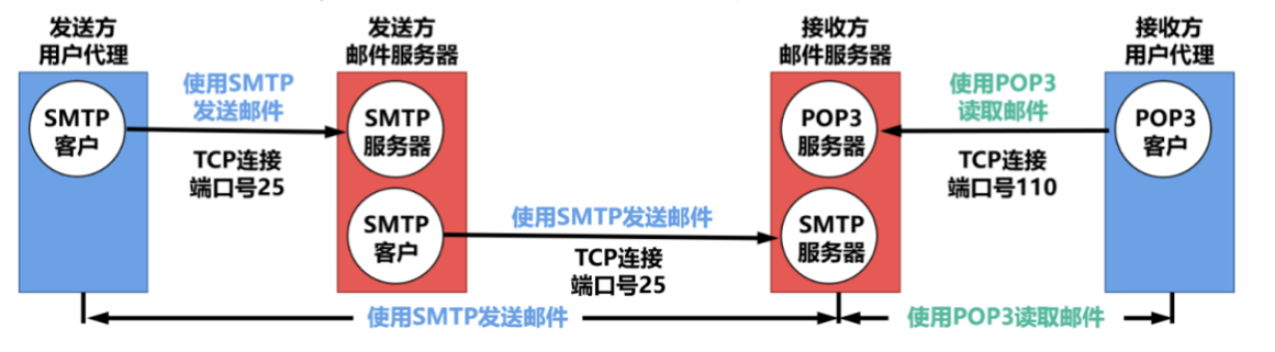 SMTP(Simple Mail Transfer Protocol):用于将邮件从发送方的用户代理发送到发送方的邮件服务器,并进一步从发送方邮件服务器传输到接收方邮件服务器;