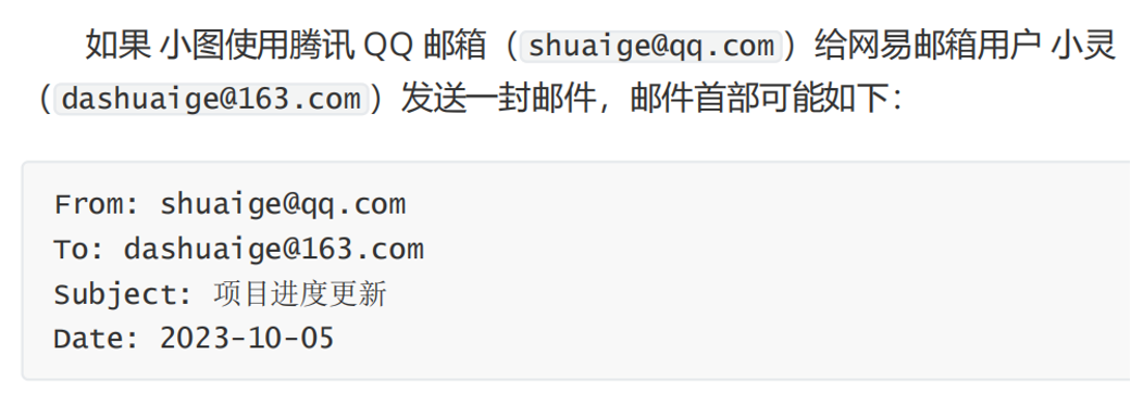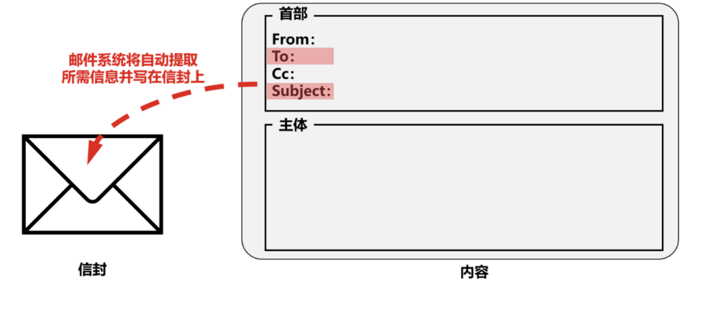 在电子邮件中,也有类似的结构,称为邮件信息格式。 电子邮件的信息格式并不是由SMTP定义的,而是在[RFC822]中单独定义的。该RFC文档已在2008年更新为[RFC 5322]。 一封电子邮件分为信封和内容两大部分。 根据 RFC 5322 的定义,电子邮件的内容又由首部和正文(主体)组成: 1. 邮件首部(Header):包含发件人、收件人、主题等元信息; 2. 邮件正文(Body):即邮件的实际内容。由用户自由撰写。 这两部分之间通过一个空行(即一个回车加换行)进行分隔。 用户根据规定填写好首部,邮件系统会自动地将首部中的信息提取出来并写在信封上,因此用户就不需要再次填写信封上的信息。 这种结构类似于 HTTP 报文格式,但专为电子邮件设计。