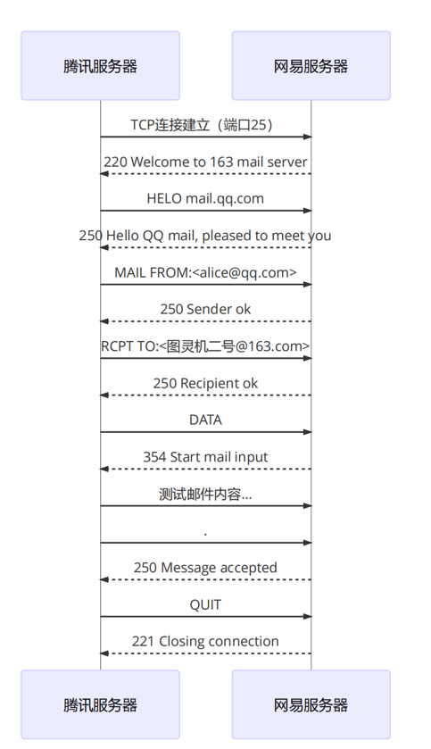 SMTP握手交互全流程 我们来看一个具体的 SMTP 通信过程示例,直观地理解其工作原理。