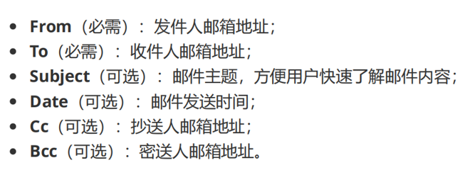 邮件首部 邮件首部由多个首部行(Header Fields)组成,每行以关键字开头,后跟冒号和值。这些首部行并不是 SMTP 协议中的命令(如 MAIL FROM 和 RCPT TO),而是邮件内容的一部分,用于描述邮件的元信息。以下是常见的首部行及其作用: