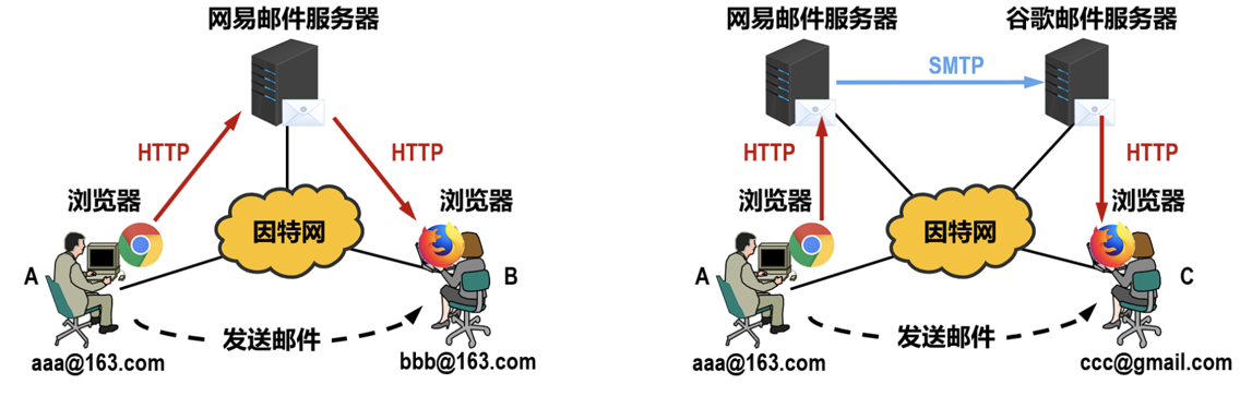 用户浏览器和邮件服务器之间不再采用SMTP和POP/IMAP协议,而是直接采用HTTP,即浏览网页的方式