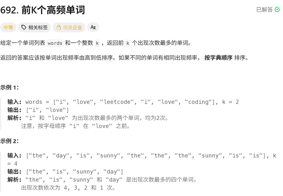 public:struct Compare{bool operator()(const pair<string,int>& x,const pair<string,int>& y){if(x.second != y.second){return x.second > y.second;}return x.first < y.first;}};vector<string> topKFrequent(vector<string>& words, int k) {map<string,int> countMap;for(auto& e:words){countMap[e]++;}vector<pair<string,int>> v(countMap.begin(),countMap.end());sort(v.begin(),v.end(),Compare());vector<string> strv;for(int i = 0;i < k;i++){strv.push_back(v[i].first);}return strv;}