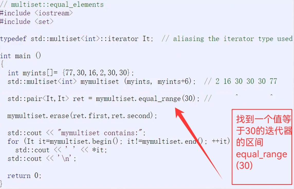 {std::set<int> myset;std::set<int>::iterator itlow, itup;for (int i = 1; i < 10; i++) myset.insert(i * 10); // 10 20 30 40 50 60 70 80 90// [30, 60]// >= 30itlow = myset.lower_bound(30); //// > 60itup = myset.upper_bound(60); // myset.erase(itlow, itup); // 10 20 70 80 90std::cout << "myset contains:";for (std::set<int>::iterator it = myset.begin(); it != myset.end(); ++it)std::cout << ' ' << *it;std::cout << '\n';return 0;