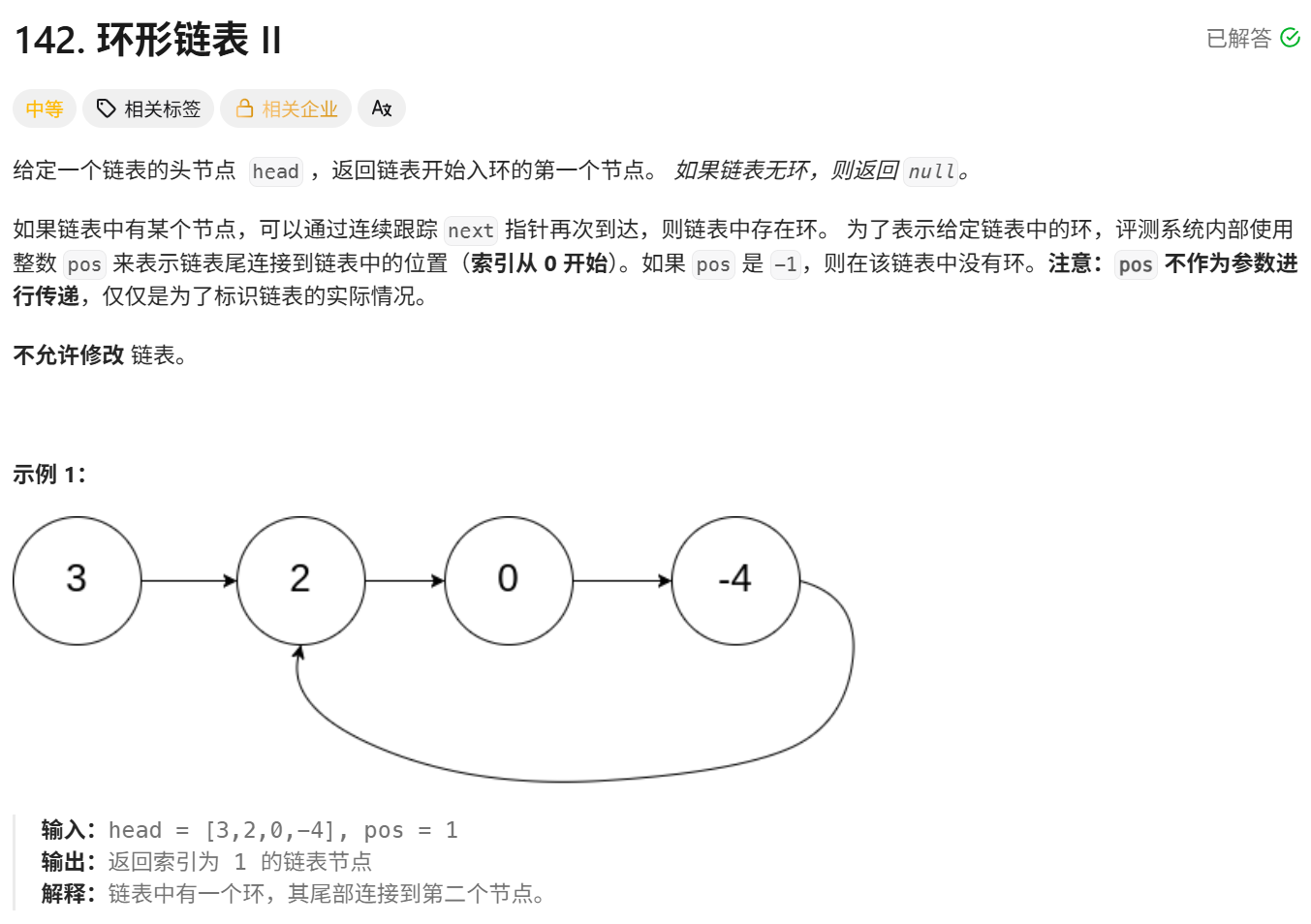 public:ListNode *detectCycle(ListNode *head) {listnode* slow=head,*fast=head;while(fast&&fast->next){slow=slow->next;fast=fast->next->next;if(slow==fast){listnode* meet=slow;while(meet!=head){meet=meet->next;head=head->next;}return meet;}}return NULL;}