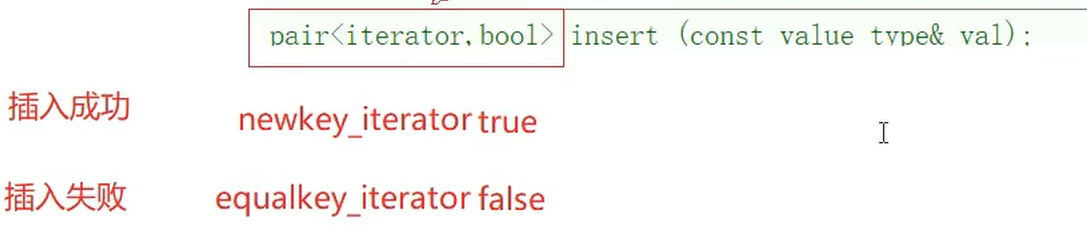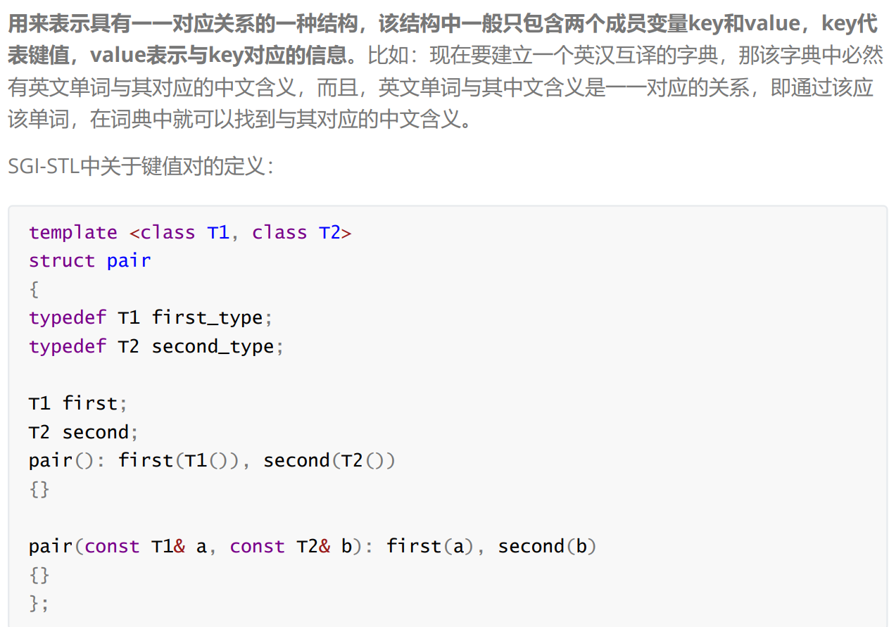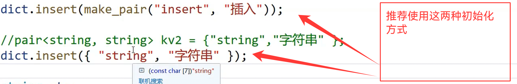 {map<string, string> dict;pair<string, string> kv1("left", "左边");dict.insert(kv1);dict.insert(pair<string, string>("right", "右边"));dict.insert(make_pair("insert", "插入"));//pair<string, string> kv2 = {"string","字符串" };dict.insert({ "string", "字符串" });return 0;