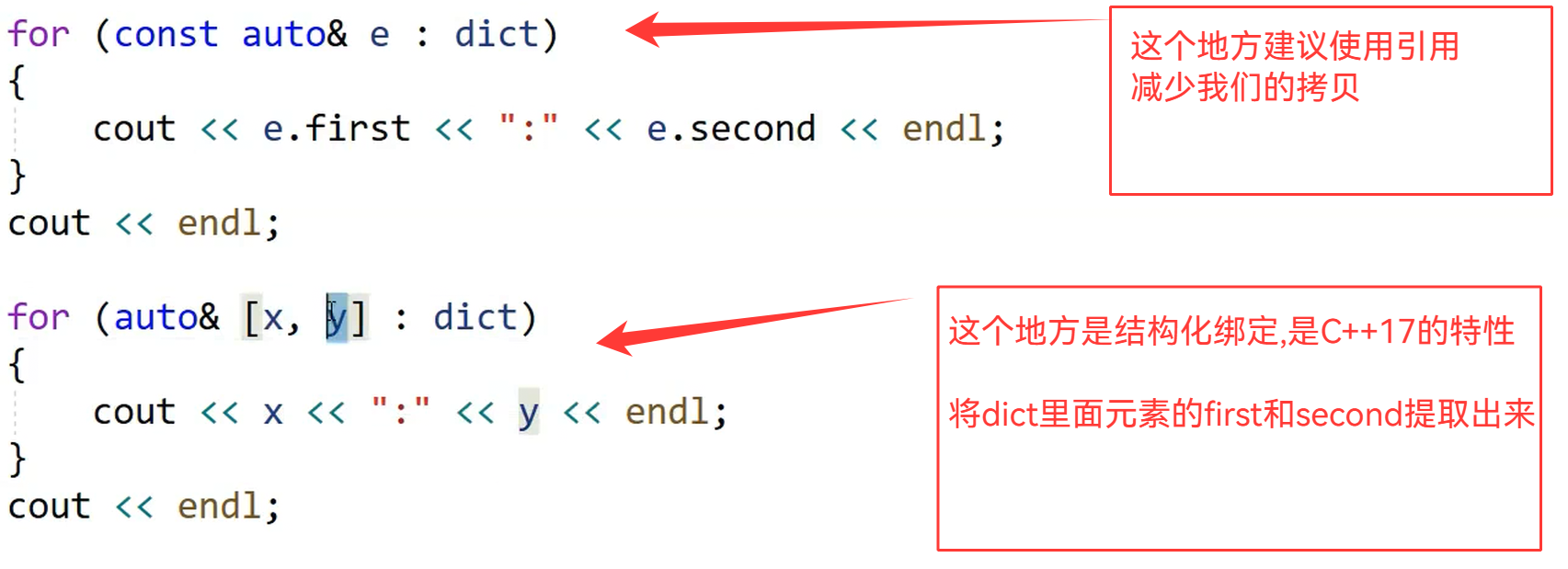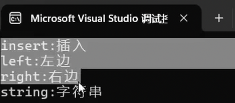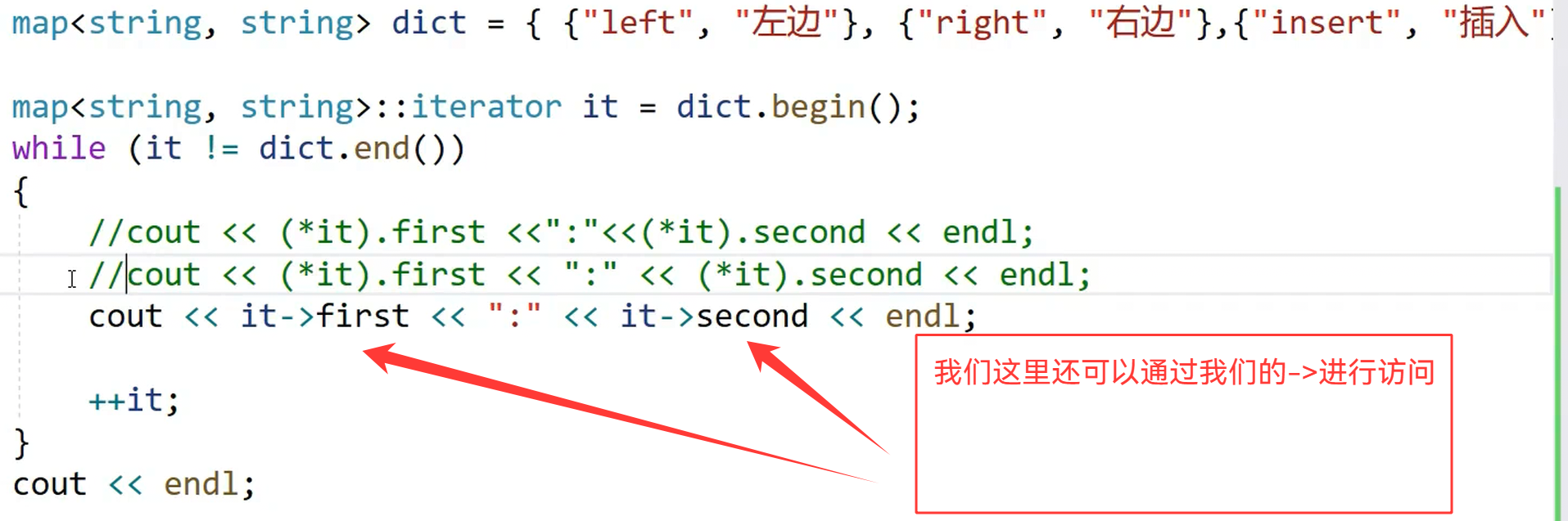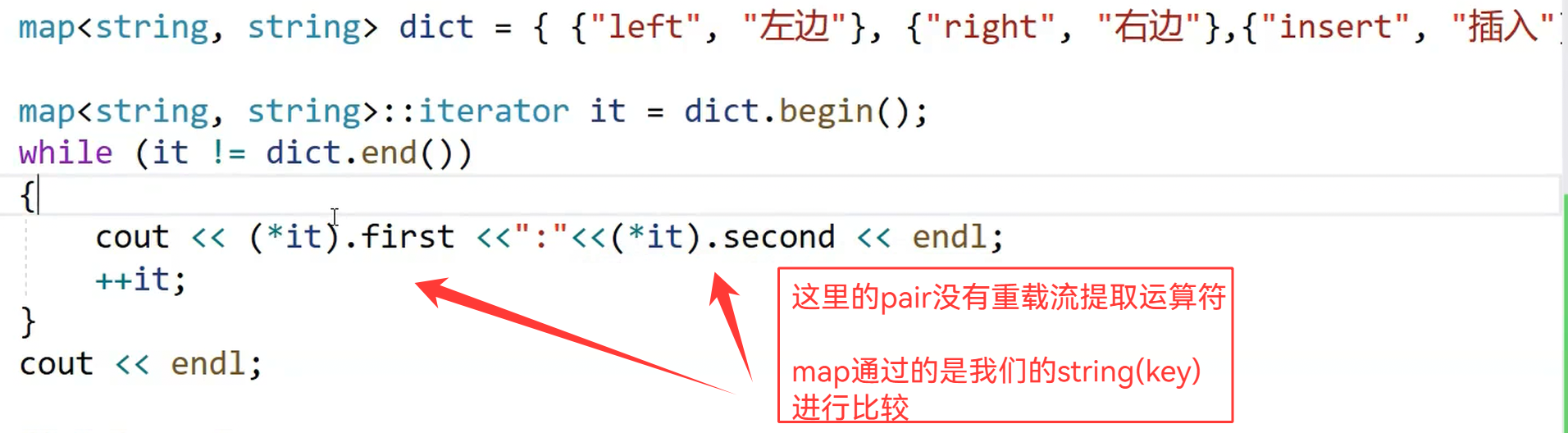 map<string, string> dict = { {"left", "左边"}, {"right", "右边"},{"insert", "插入"},{ "string", "字符串" } };map<string, string>::iterator it = dict.begin();while (it != dict.end()){//cout << (*it).first <<":"<<(*it).second << endl;//cout << (*it).first << ":" << (*it).second << endl;cout << it->first << ":" << it->second << endl;++it;}cout << endl;for (const auto& e : dict){cout << e.first << ":" << e.second << endl;}cout << endl;/*for (auto& [x, y] : dict){cout << x << ":" << y << endl;}cout << endl;*/