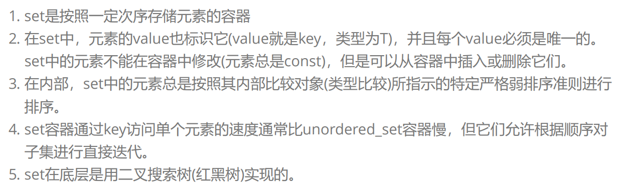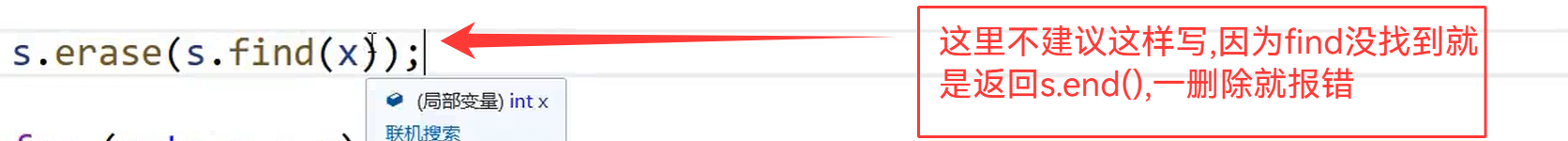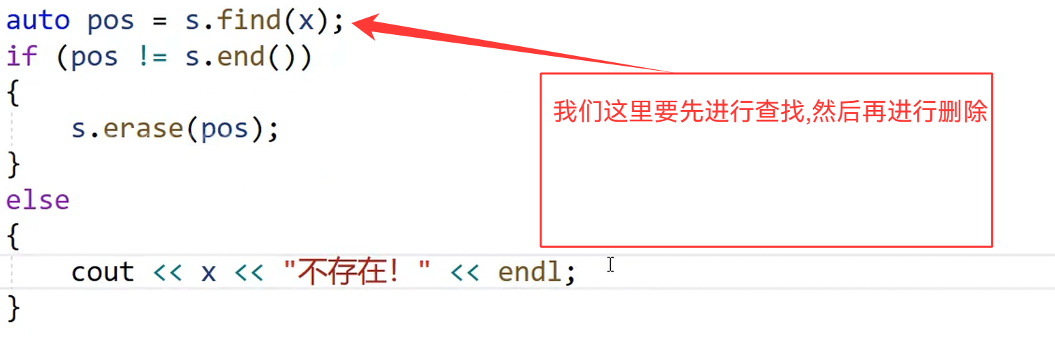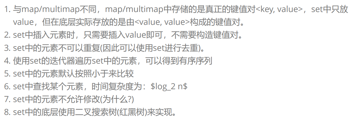 {// 去重+排序set<int> s;s.insert(5);s.insert(2);s.insert(7);s.insert(4);s.insert(9);s.insert(9);s.insert(9);s.insert(1);s.insert(5);s.insert(9);//set<int>::iterator it = s.begin();auto it = s.begin();while (it != s.end()){cout << *it << " ";++it;}cout << endl;
