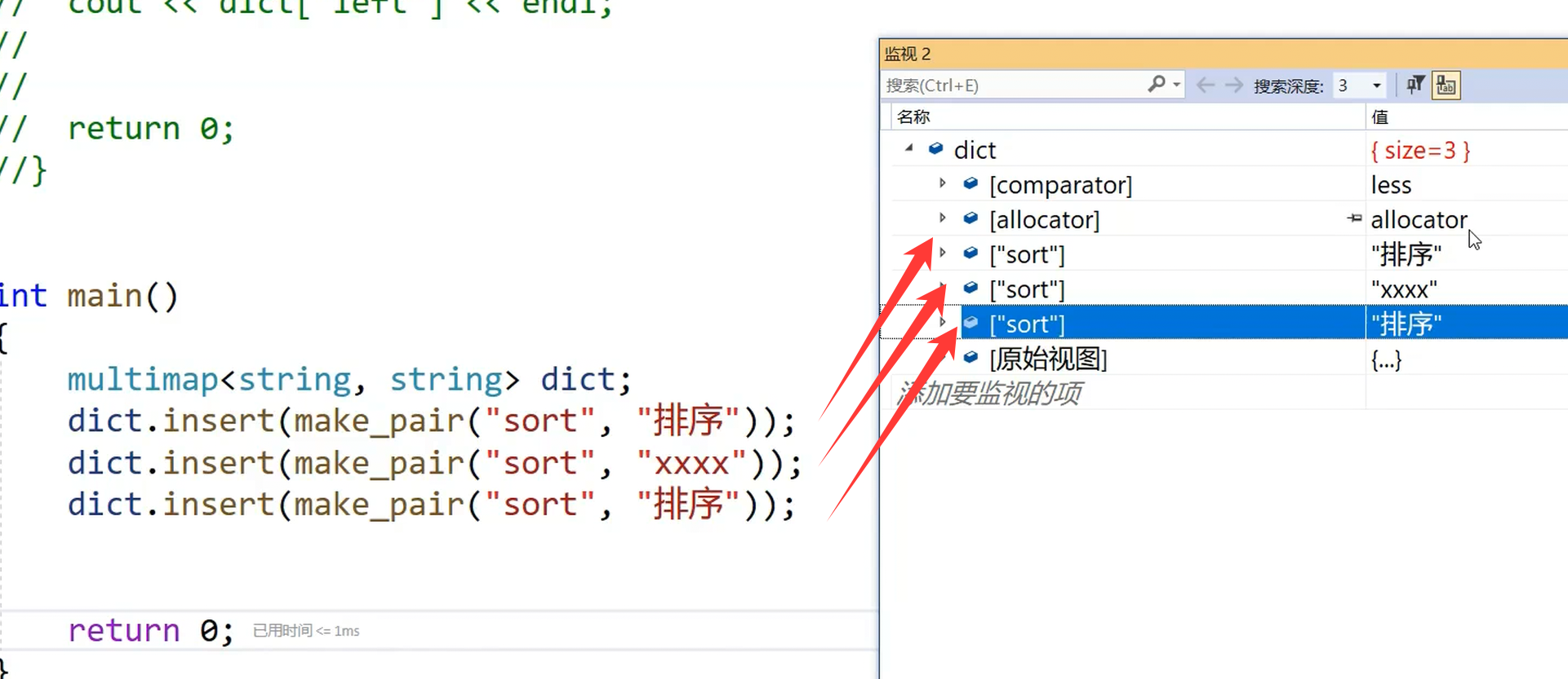 {multimap<string, string> dict;dict.insert(make_pair("sort", "排序"));dict.insert(make_pair("sort", "xxxx"));dict.insert(make_pair("sort", "排序"));return 0;