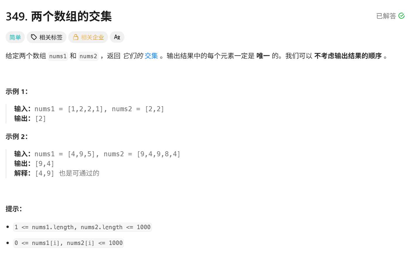public:vector<int> intersection(vector<int>& nums1, vector<int>& nums2) {std::set<int> s1(nums1.begin(), nums1.end());std::set<int> s2(nums2.begin(), nums2.end());std::vector<int> ret;auto it1 = s1.begin();auto it2 = s2.begin();while (it1 != s1.end() && it2 != s2.end()) {if (*it1 < *it2) {it1++;} else if (*it1 > *it2) {it2++;} else {ret.push_back(*it1);it1++;it2++;}}return ret;}