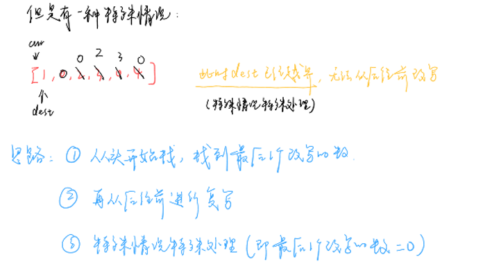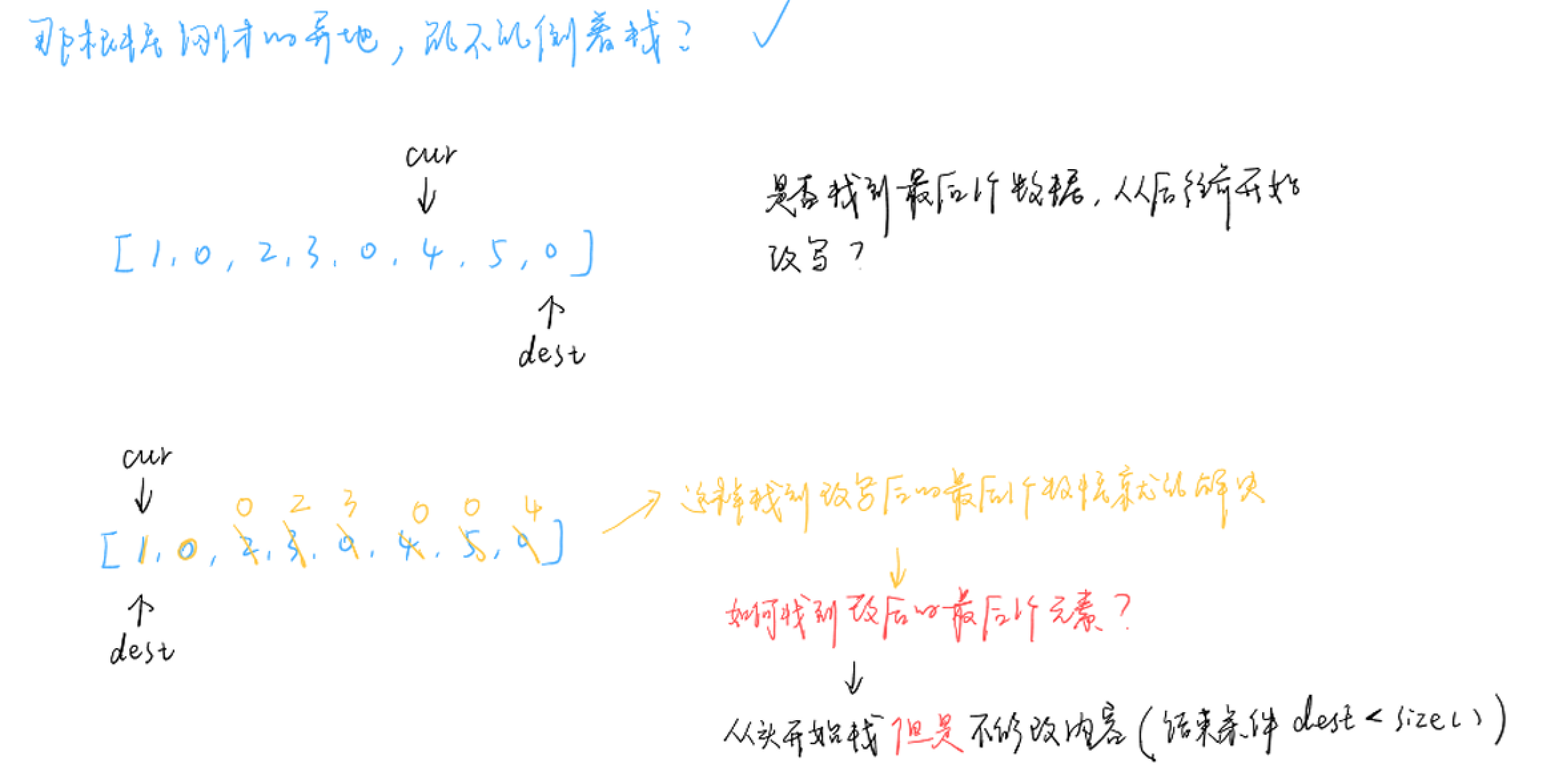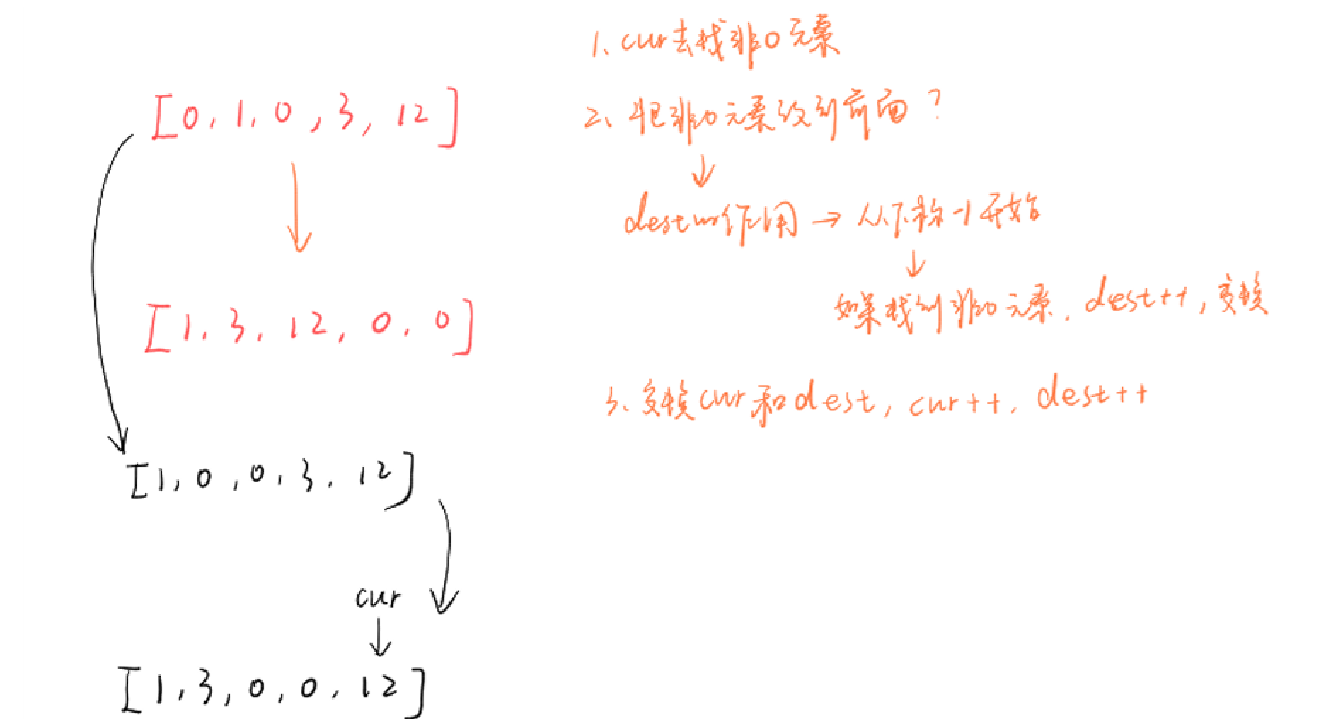 1. 定义两个双指针cur(用来遍历数组),dest(最后一个非零元素的下标):