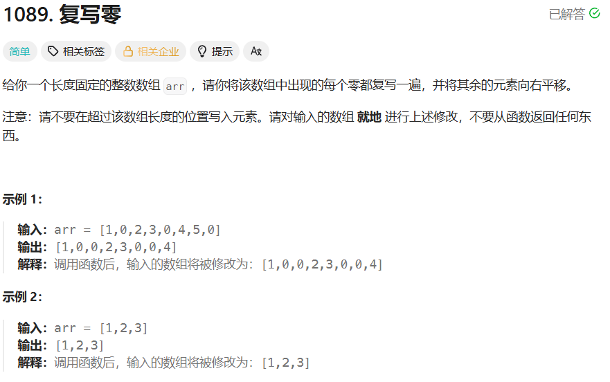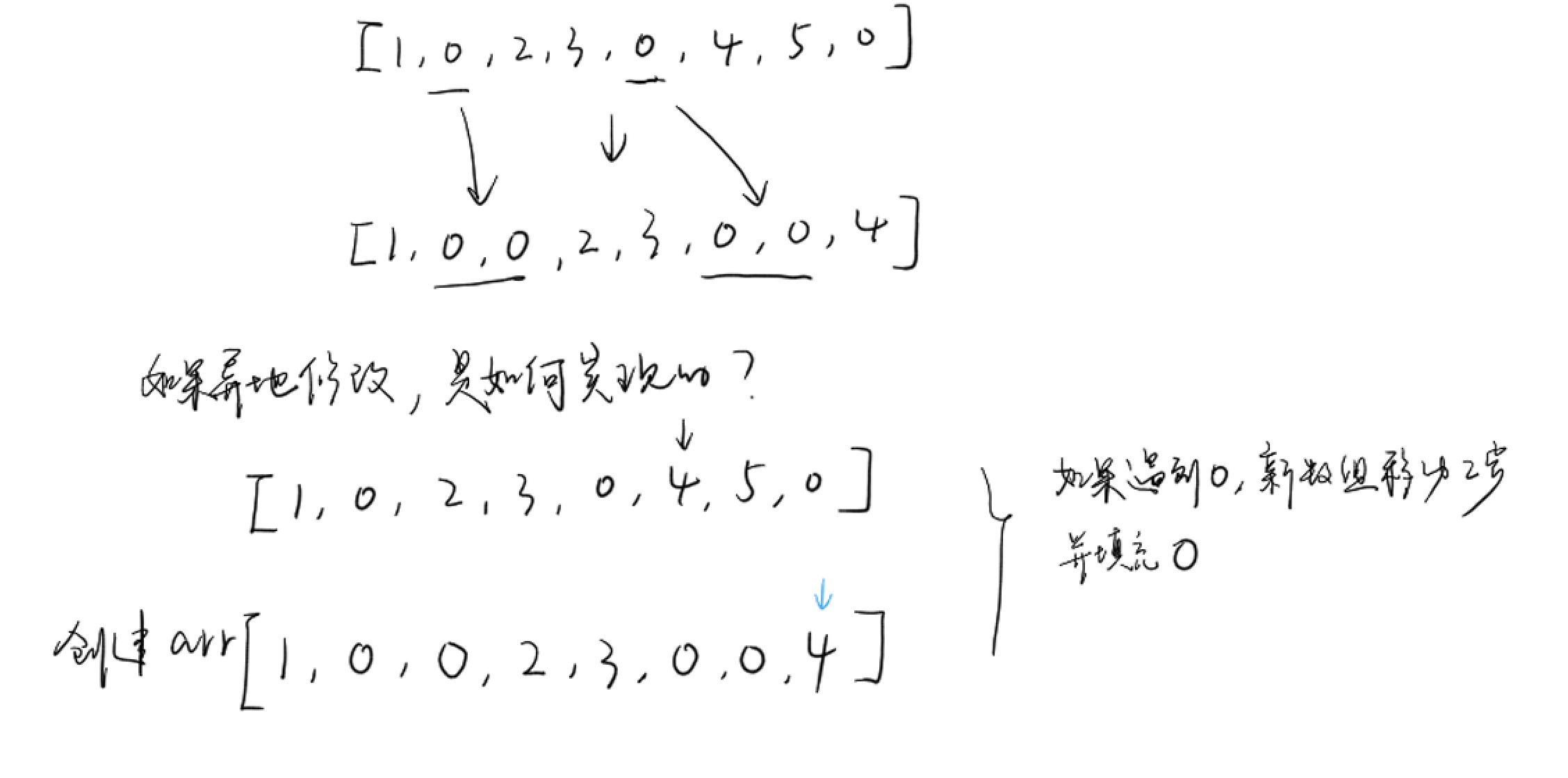 public:void duplicateZeros(vector<int>& arr) {int cur = 0;int dest = -1;for (cur = 0; cur < arr.size(); cur++){if (arr[cur] == 0){dest += 2;}else{dest++;}if (dest >= arr.size()-1) //这里不要忘记dest=size()-1也要结束break;}if (dest == arr.size()){arr[arr.size()-1] = 0;cur--;dest -= 2;}while (cur >= 0){if (arr[cur]){arr[dest--] = arr[cur--];}else{arr[dest--] = 0;arr[dest--] = 0;cur--;}}}