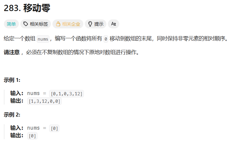 public:void moveZeroes(vector<int>& nums) {int cur = 0;int dest = -1;for(cur=0;cur<nums.size();cur++){// 找到非零元素if(nums[cur]){swap(nums[++dest],nums[cur]);}}}