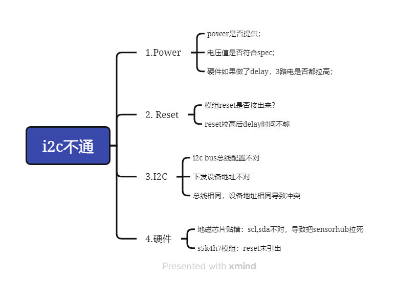 power电压、reset复位、i2c bus、i2c 地址、硬件贴错;