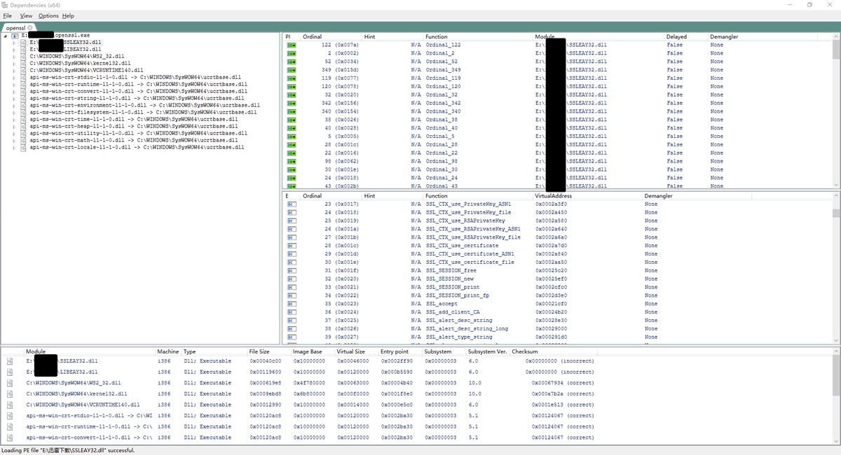 左侧面板以树状结构显示所有依赖的 DLL,展开可查看层级。