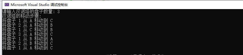 }int main() {int n;printf("请输入汉诺塔的盘子数量: ");scanf("%d", &n);printf("汉诺塔的移动步骤:\n");hanoi(n, 'A', 'C', 'B'); // A是起始柱,C是目标柱,B是辅助柱getchar();return 0;