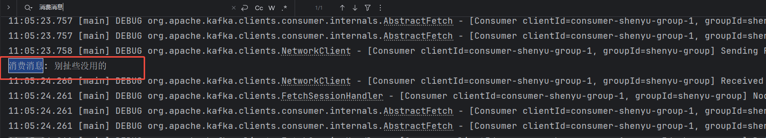 public class KafkaTest {public static void main(String[] args) {String bootstrapServers = "yourip:9099";String topic = "kafa-test--log";// producer(bootstrapServers, topic);consumer(bootstrapServers, topic);}private static void consumer(String bootstrapServers, String topic) {Properties props = new Properties();props.put("bootstrap.servers", bootstrapServers);props.put("group.id", "shenyu-group");props.put("key.deserializer", "org.apache.kafka.common.serialization.StringDeserializer");props.put("value.deserializer", "org.apache.kafka.common.serialization.StringDeserializer");props.put("auto.offset.reset", "latest");try (KafkaConsumer<String, String> consumer = new KafkaConsumer<>(props)) {consumer.subscribe(Collections.singletonList(topic));while (true) {ConsumerRecords<String, String> records = consumer.poll(Duration.ofMillis(1000));for (ConsumerRecord<String, String> record : records) {System.out.printf("消费消息: %s%n", record.value());}}}}/*** 生产者* @param bootstrapServers* @param topic*/private static void producer(String bootstrapServers, String topic) {createTopicIfNotExists(bootstrapServers, topic);Properties props = new Properties();props.put("bootstrap.servers", bootstrapServers);props.put("key.serializer", StringSerializer.class.getName());props.put("value.serializer", StringSerializer.class.getName());try (KafkaProducer<String, String> producer = new KafkaProducer<>(props)) {String message = "别扯些没用的";ProducerRecord<String, String> record = new ProducerRecord<>(topic, "test-key",message);producer.send(record, (metadata, exception) -> {if (exception == null) {System.out.println("sent to topic: " + metadata.topic());} else {exception.printStackTrace();}});}}/*** topic不存在则创建,可以自己在kafka-ui中创建* @param bootstrapServers* @param topic*/private static void createTopicIfNotExists(String bootstrapServers, String topic) {Properties adminProps = new Properties();adminProps.put(AdminClientConfig.BOOTSTRAP_SERVERS_CONFIG, bootstrapServers);try (AdminClient adminClient = AdminClient.create(adminProps)) {// 获取已存在的 topic 列表Set<String> topics = adminClient.listTopics().names().get();if (!topics.contains(topic)) {// 创建 topic(默认1个分区,1个副本)NewTopic newTopic = new NewTopic(topic, 1, (short) 1);adminClient.createTopics(Collections.singleton(newTopic)).all().get();System.out.println("create topic : " + topic);} else {System.out.println("topic already exists: " + topic);}} catch (InterruptedException | ExecutionException e) {e.printStackTrace();}}