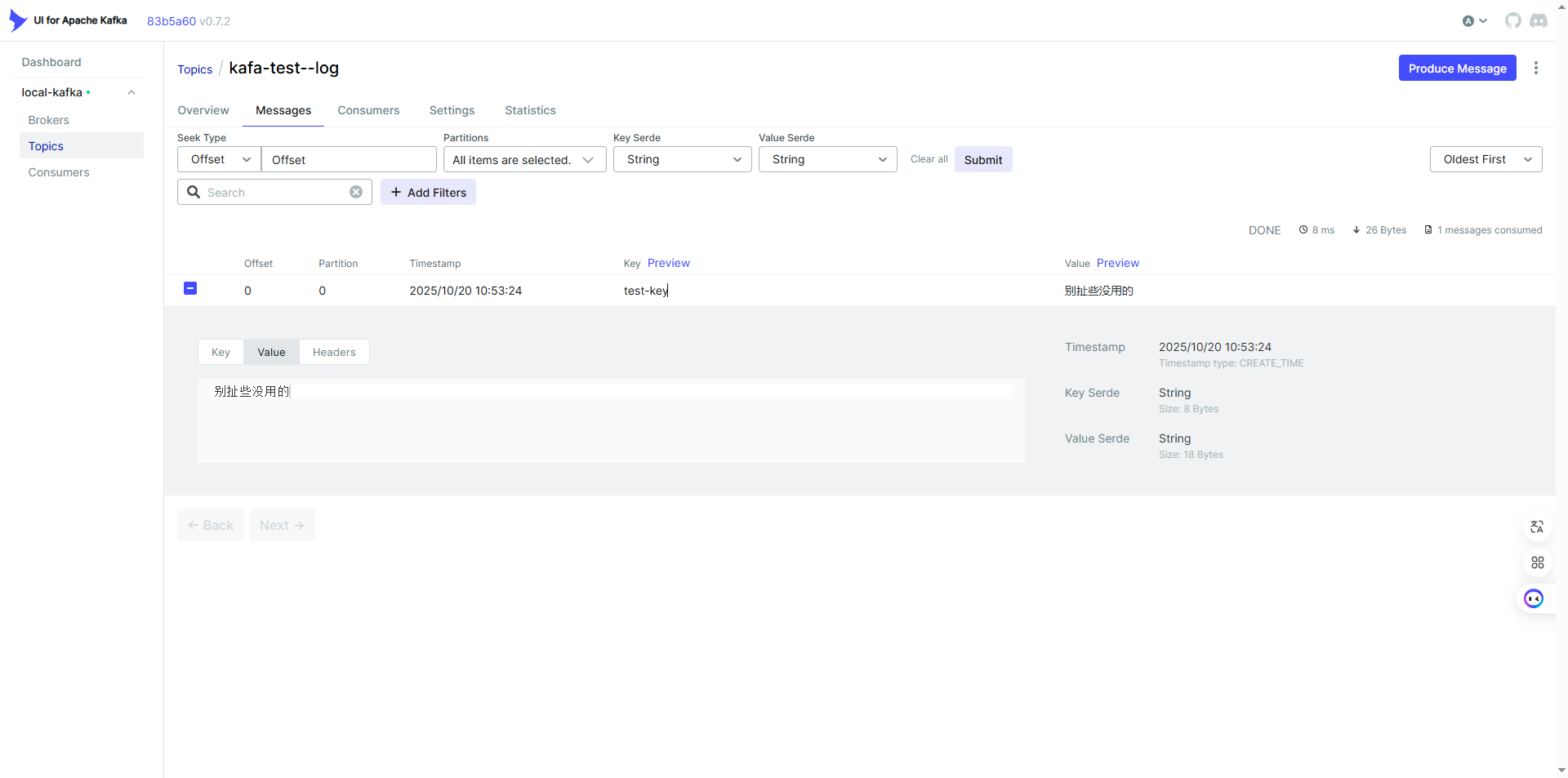 搭建本地 Kafka 环境,通过 Kafka-UI 可视化管理工具进行消息查看和调试的过程。