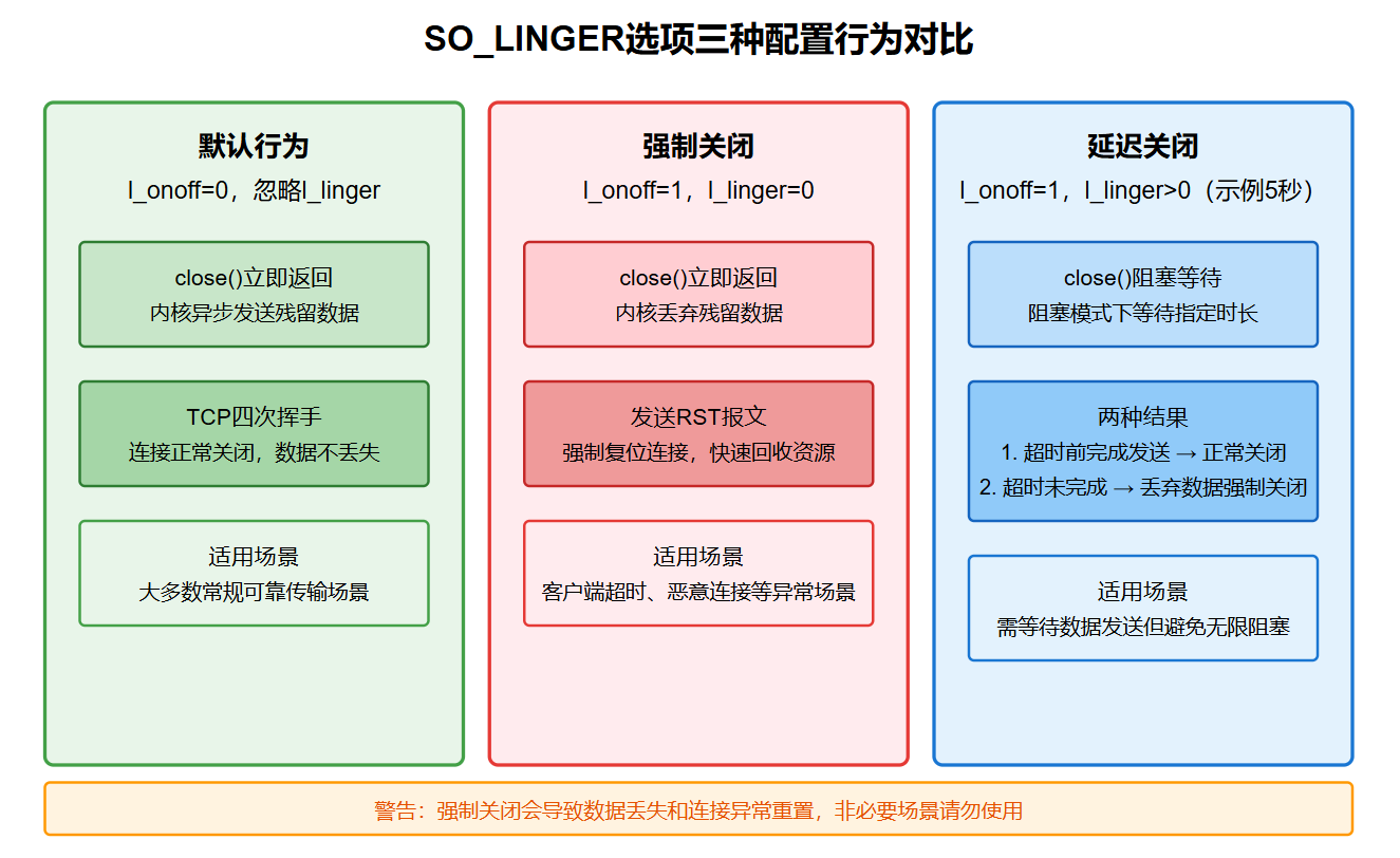 在实际开发中,需根据业务需求选择合适的策略,避免因滥用SO_LINGER