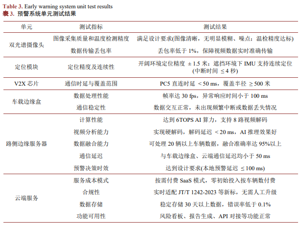 预警系统单元测试结果是室内和现场测试的综合结果,列于表3。单元测试结果表明,各单元在主要指标上满足MIEC-EWS设计要求,但部分指标(如复杂雾天热红外图像细节)还有待根据真实应用场景进一步优化。