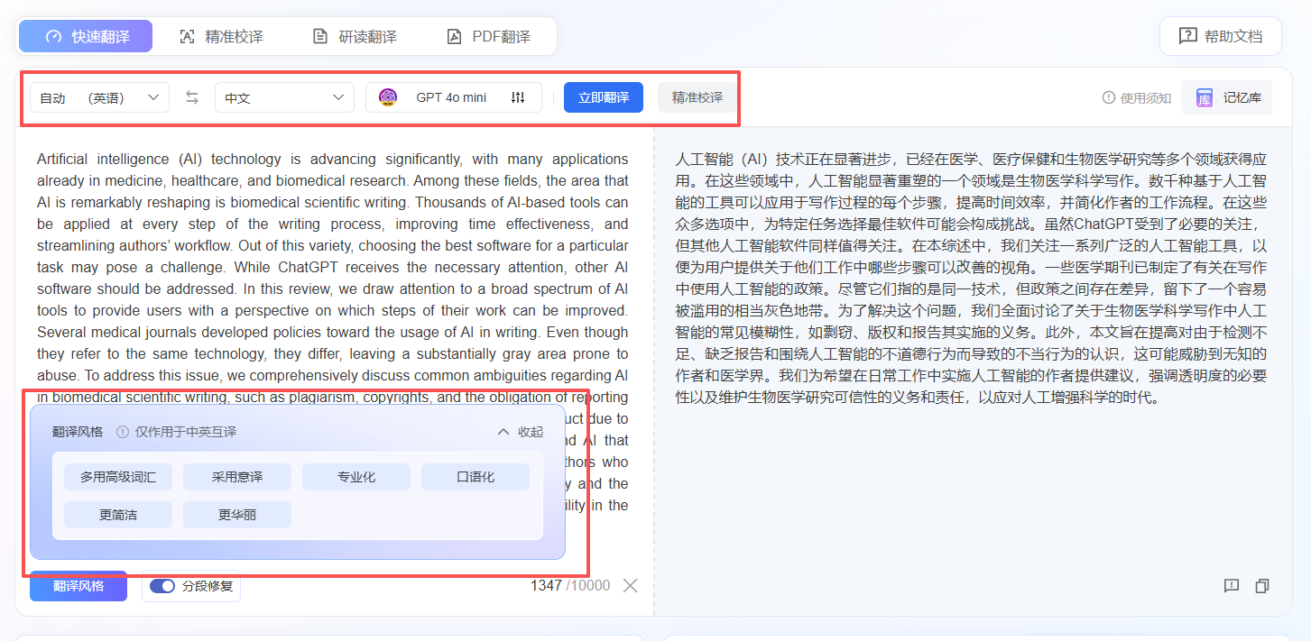 支持一键多语互译,涵盖中、英、法、德等 12 种语言,能够满足不同语种文献的阅读需求。同时,提供翻译风格调整选项,用户可根据具体语境和阅读需求,灵活设置中英互译的风格。操作上,只需输入文本或上传文献,数秒内即可完成精准翻译。