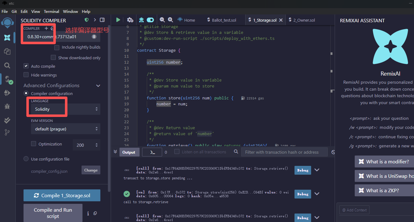 配置好编译器型号、语言使用solidy,点击compile进行编译,编译成功会有绿色的打勾标识