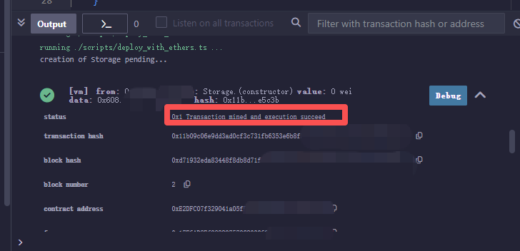 可以注意到,执行部署之后,账号里的以太币随之减少了(但是不能代表一定部署成功,因为不管部署结果怎么样都是要给小费的)