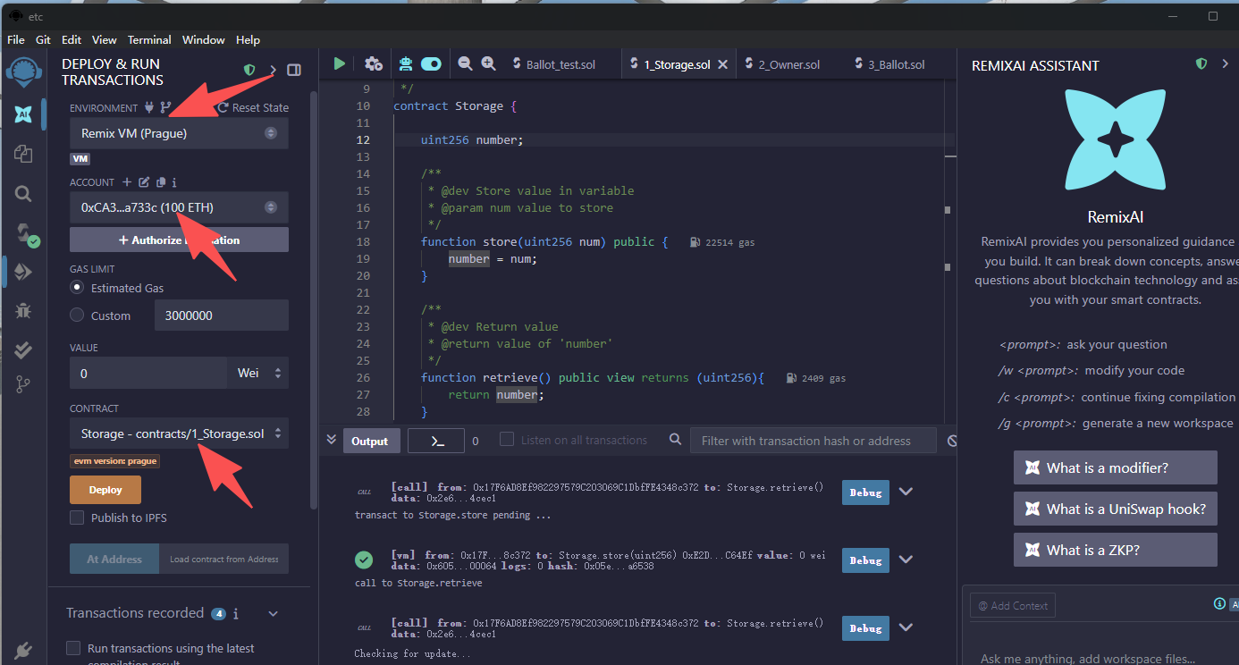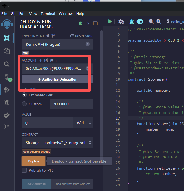 选择EVM和account,remix里会提供十几个账号用于测试,每个账号都有一些ETH