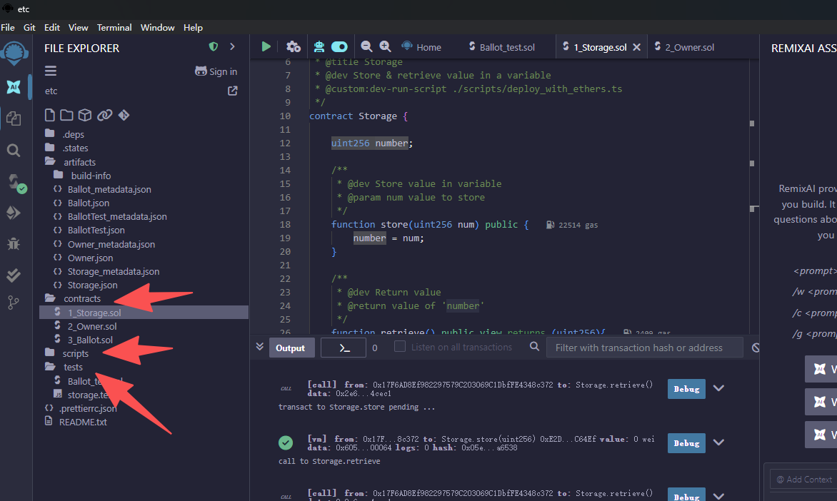 新创建的项目里有如下三个文件夹(contracts、scripts、tests),当执行了其中的sol文件之后才会出现artifacts目录