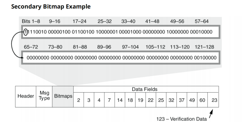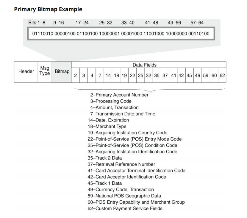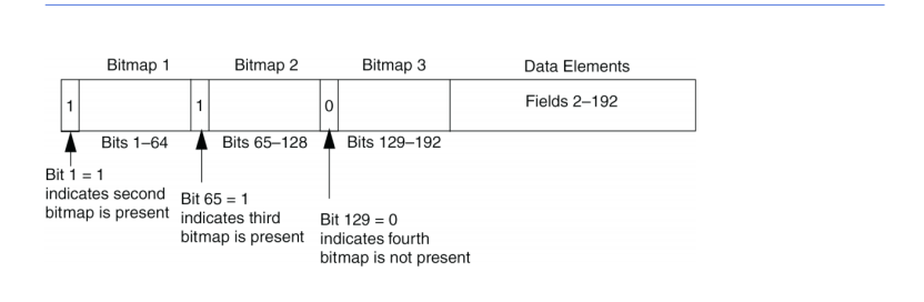 3 | Primary Bitmap & Secondary Bitmap & ThirdBitmap | 位图用于标识报文中实际存在的 Data Element 字段。每个 bit 对应 1 个 ISO 字段,当 bit 值为 1 时表示该字段存在。 |