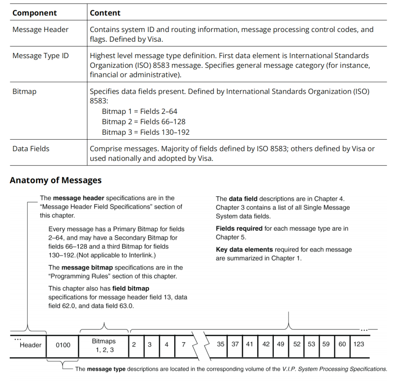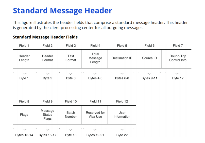 VisaNet 直连交易消息遵循 ISO 8583:1993 (Visa Extended Format) 标准,结合 Visa 自定义的报文头(Message Header)、专用私有域(如 Field 63 等)及 VisaNet 路由标识信息。