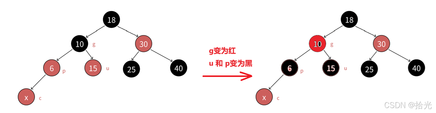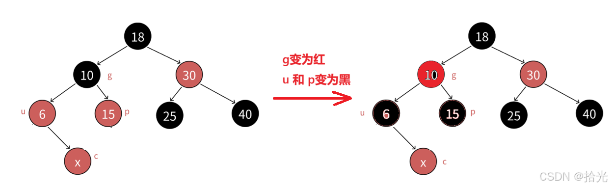 情况一又根据 u 结点是左孩子还是右孩子分为两种情况,但是,对于这两种情况处理方式相同,即将 g 变为红,u 和 p 变为黑。但是,需要注意一点:g 变为红色后,也有可能 g 的父亲结点为红色,所以需要继续向上处理,即 c 指向 g ,p 和 g 同时更新,直到所有结点满足红黑树规则。