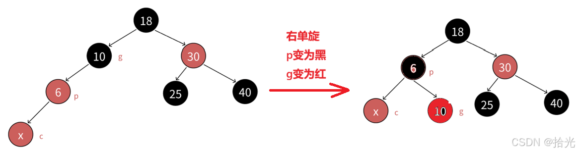 • p 为左孩子且c 为左孩子(右单旋+变色)