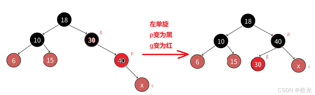 • p 为右孩子且 c 为右孩子(左单旋+变色)