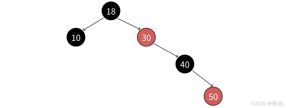 • 如果结点为红色,那么该节点的两个孩子节点为黑色,即任意一条路径上没有连续的红色节点;