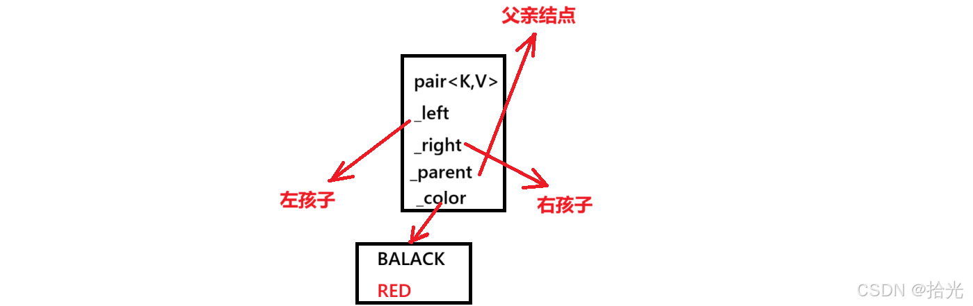 对于结点,我们需要一个pair来存储键值对;left指针指向左孩子结点;right指针指向右孩子结点;color变量存储结点颜色;后面插入结点时,如果需要调整平衡,则要频繁地访问父亲结点,所以还需要一个parent指针指向父亲结点(与AVL数相同)。