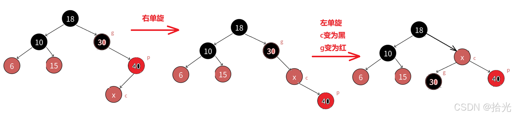 • p 为右孩子且 c 为左孩子(双旋+变色)