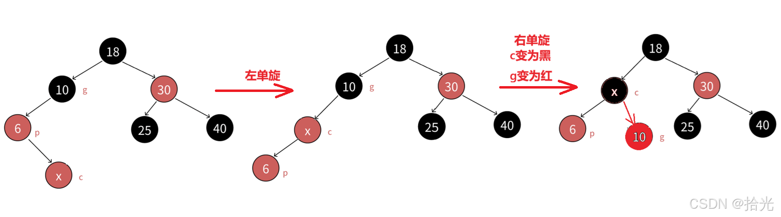 • p 为左孩子且c 为右孩子(双旋+变色)
