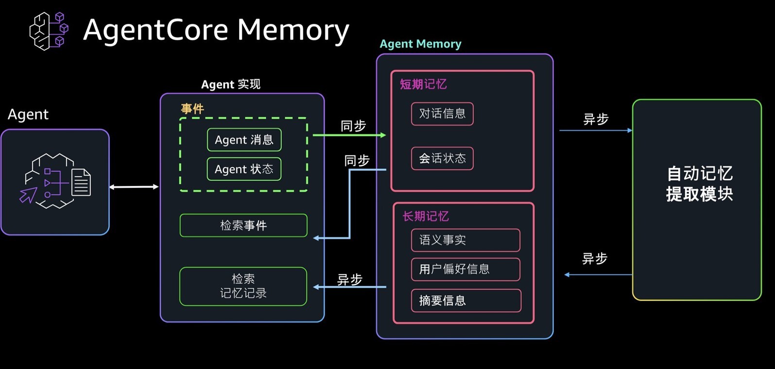 Amazon Bedrock AgentCore 的 Memory 模块是一个由亚马逊云科技托管的持久化记忆系统,用于存储和管理 AI Agent 的对话和知识。它提供短期记忆(short-term memory)和长期记忆(long-term memory)两种模式。短期记忆负责在一次会话中记录最近的最近几轮对话,确保代理能够“记住”当前对话的上下文。长期记忆则从对话中提取结构化的关键信息,在多个会话之间保留知识,使Agent能够“学习”用户偏好、事实和摘要等信息。