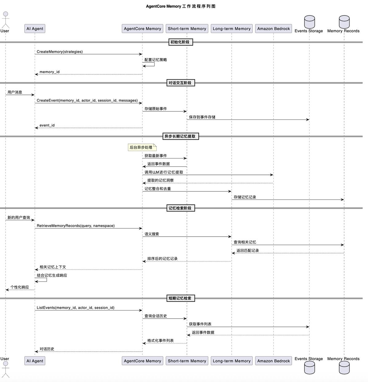 图2 – Bedrock AgentCore Memory从初始化到记忆检索的完整工作流程序列图