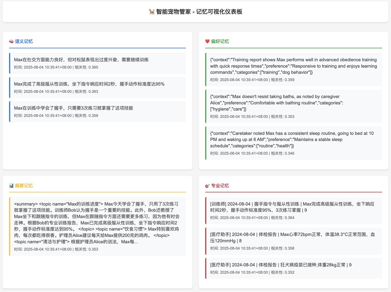 def create_multi_agent_system(memory_id, session_id):"""创建多Agent协作系统"""agents = {}for role_key, role_info in AGENT_ROLES.items():# 每个Agent使用独立的actor_id和命名空间provider = AgentCoreMemoryToolProvider(memory_id=memory_id,actor_id=role_info['actor_id'],session_id=session_id,namespace=f"/pets/{role_info['actor_id']}/knowledge")# 创建专业化的Agentagents[role_key] = Agent(tools=provider.tools,system_prompt=f"""你是{role_info['name']},专门负责宠物Max的{role_info['expertise']}。请根据你的专业领域提供建议,并与其他专业团队成员协作。""")return agents