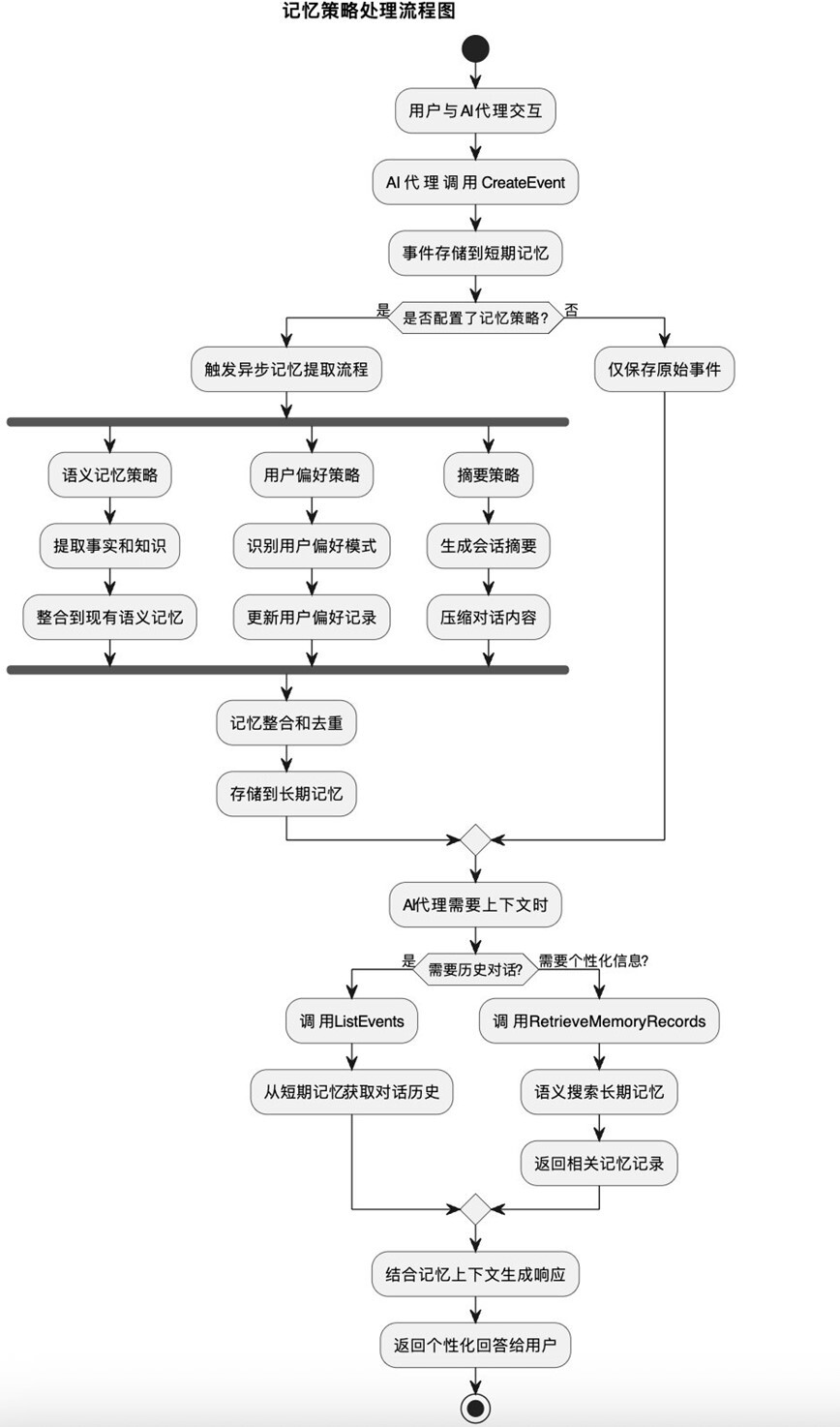 用LLM进行记忆提取(Memory → LLM):Memory 的长期记忆依赖于对对话内容的自动分析和提炼,这由 LLM完成。AgentCore Memory 内置了多种记忆策略(Memory Strategy)来定义如何将原始对话转化为结构化长期记忆。例如: