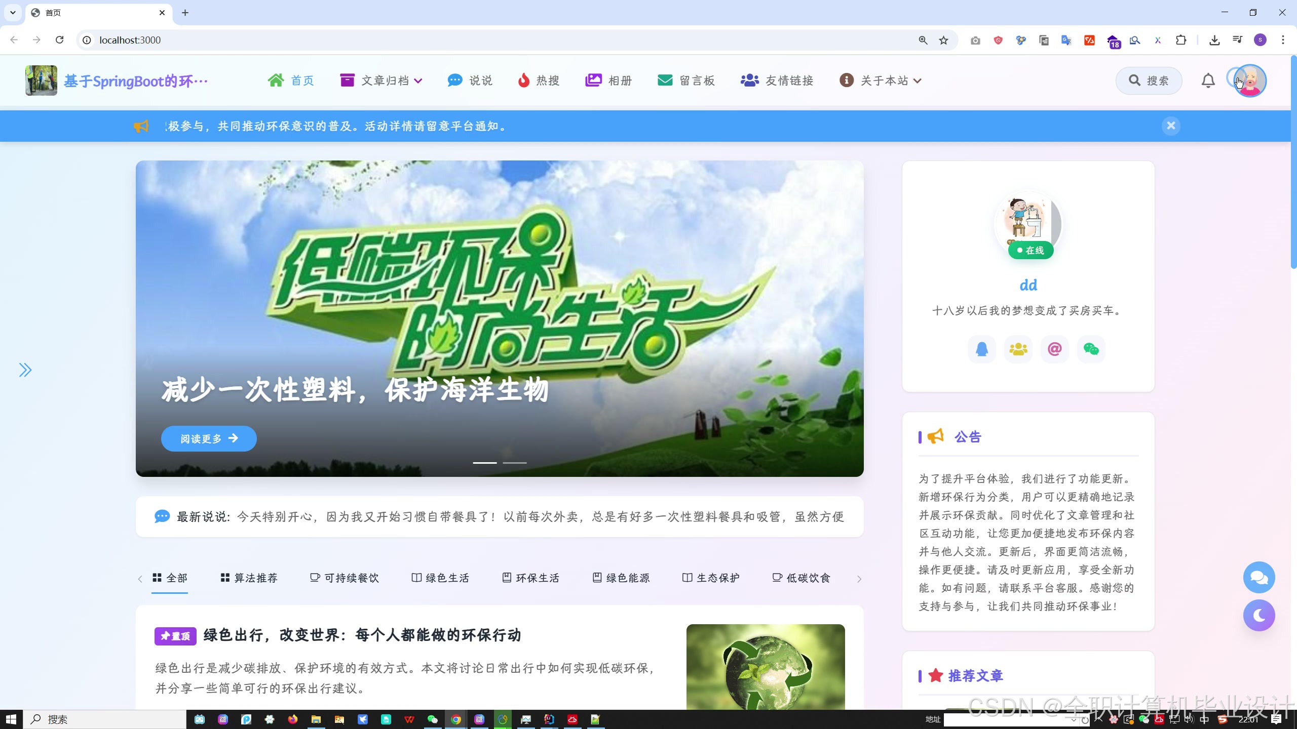 这是一个旨在推广环保理念、记录环保行为、促进社区互动的综合性平台,支持管理员和用户两种角色。