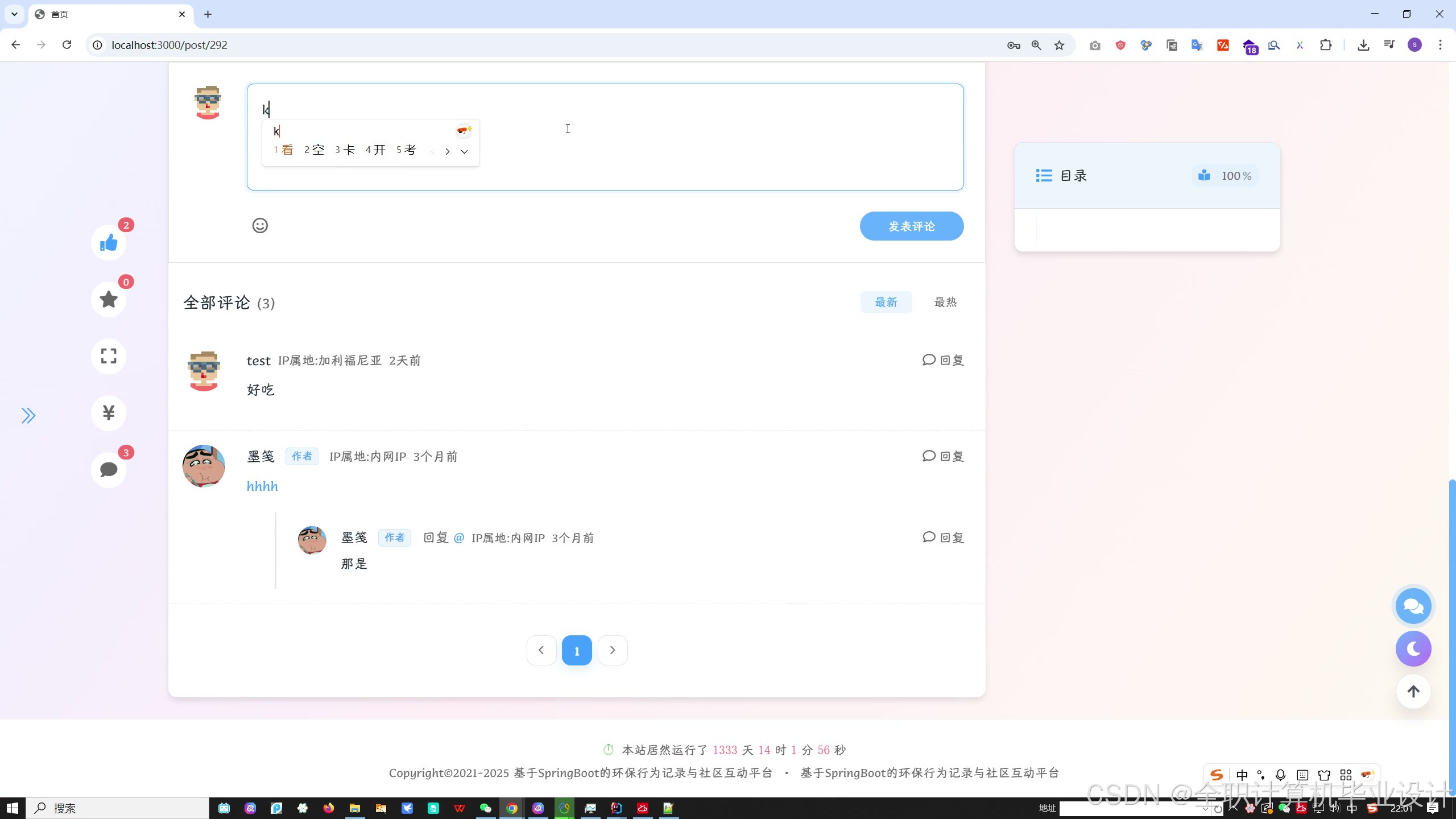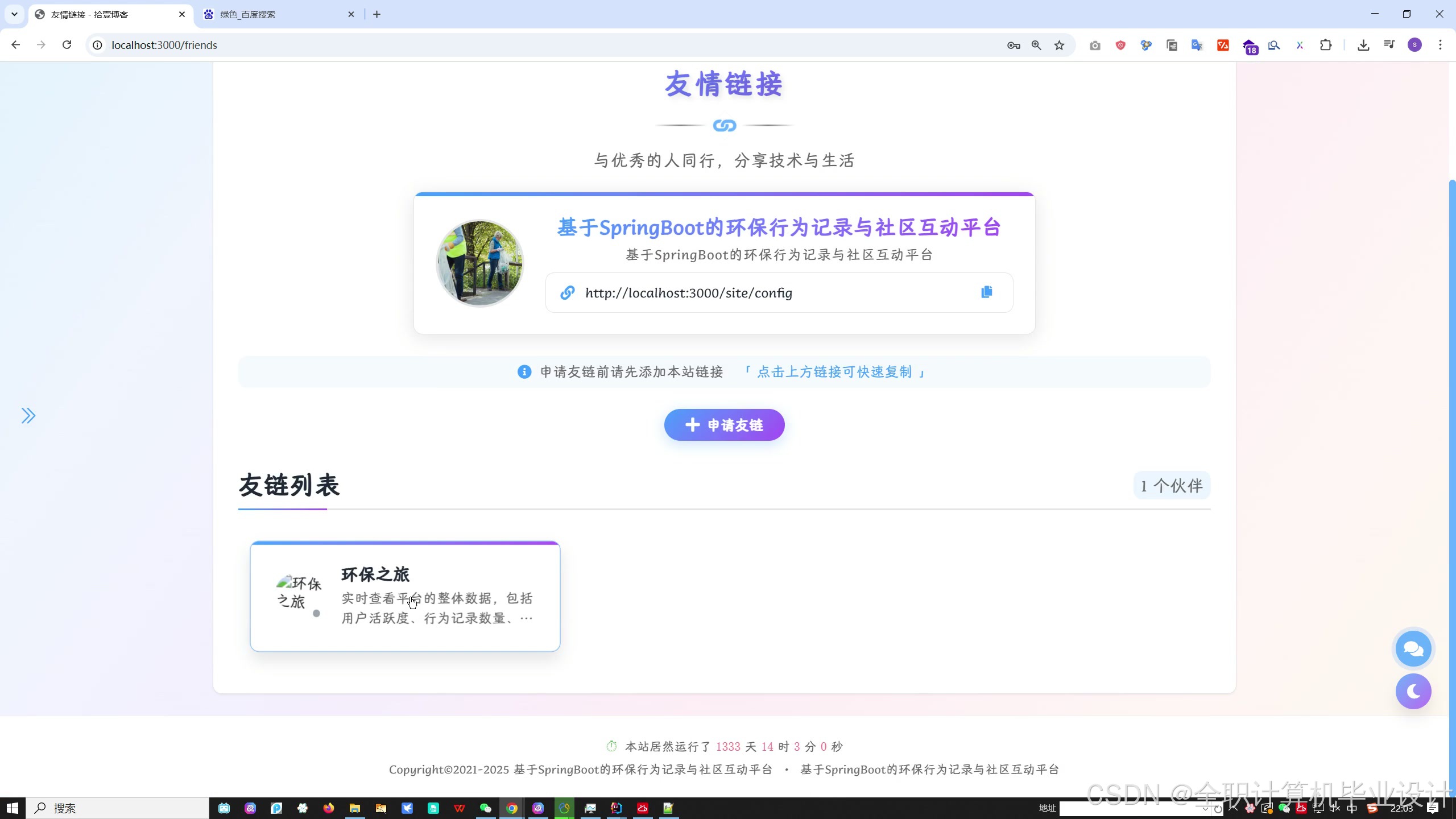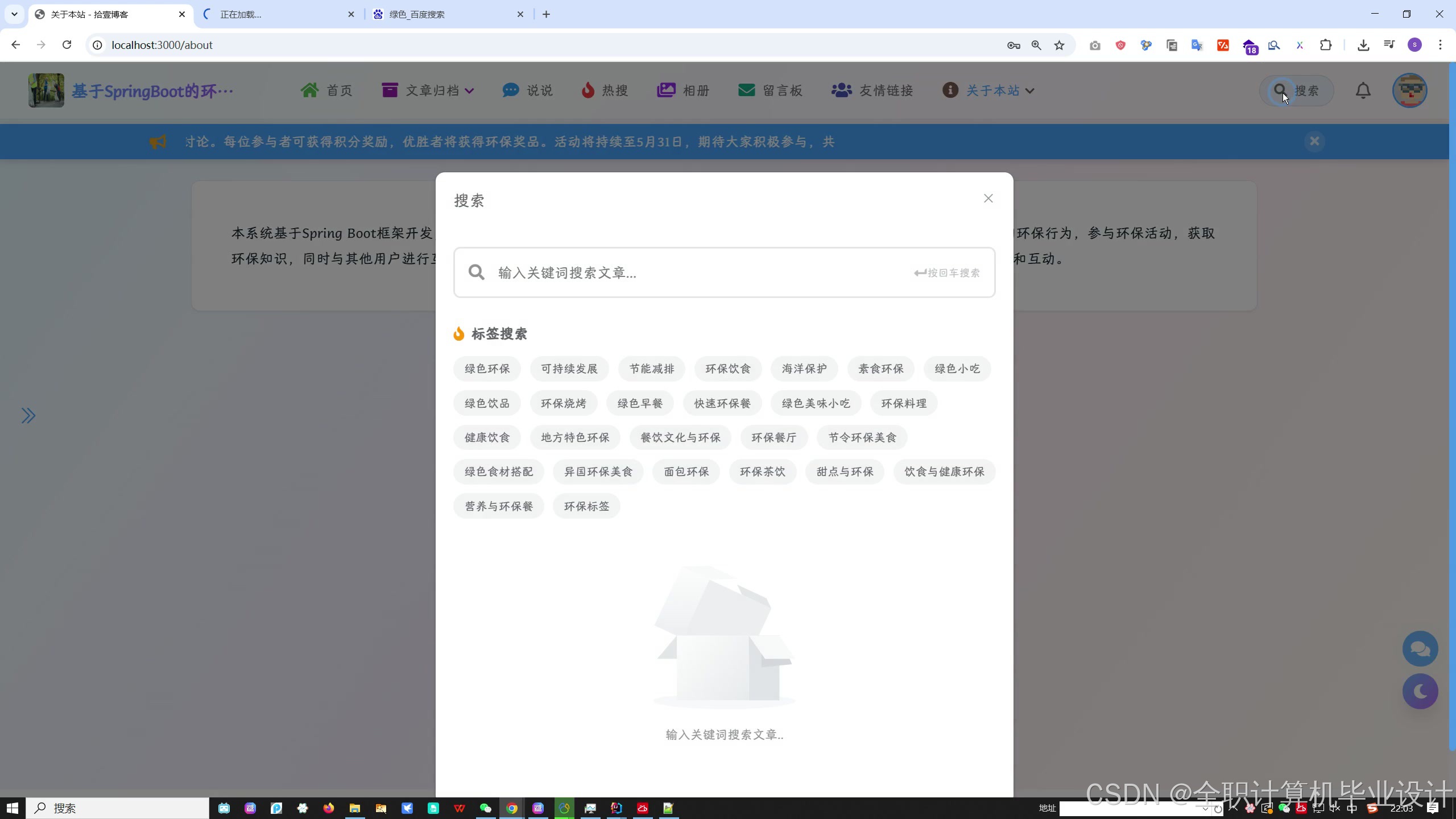 传统环保平台多为单向宣传,本系统创新性地将**个人环保行为数字化**,通过**社区互动**产生影响力,用**激励机制**促进持续参与,形成环保行为的**闭环生态**。