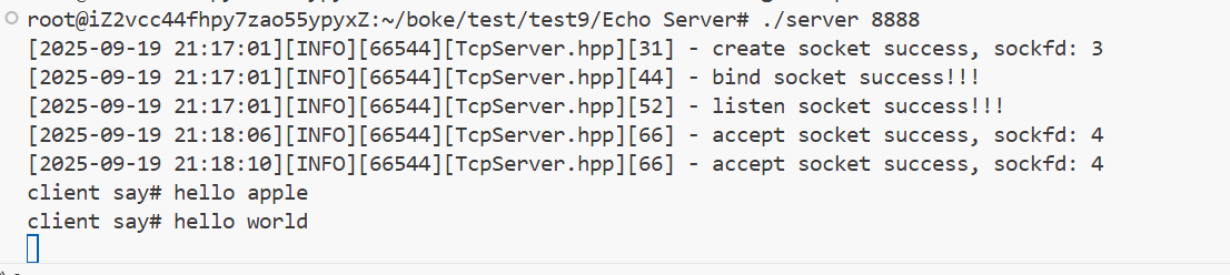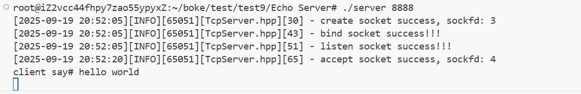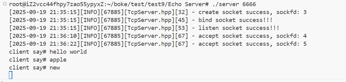 private:void Server(int sockfd) {char buffer[4096];// 一直进行IO操作while(true) {// 可以使用文件的读写接口直接进行通信ssize_t n = read(sockfd, buffer, sizeof(buffer) - 1);if(n > 0) {buffer[n] = 0;std::cout << "client say# " << buffer << std::endl;std::string echo = "server echo# ";echo += buffer;write(sockfd, echo.c_str(), echo.size());}else if(n == 0) { // 说明读到结尾,关闭连接LOG(LogLevel::INFO) << "client quit...";break;}else { // 文件读取出现错误LOG(LogLevel::ERROR) << "read sockfd error, errno: " << errno << ", error string: " << strerror(errno);break;}}}