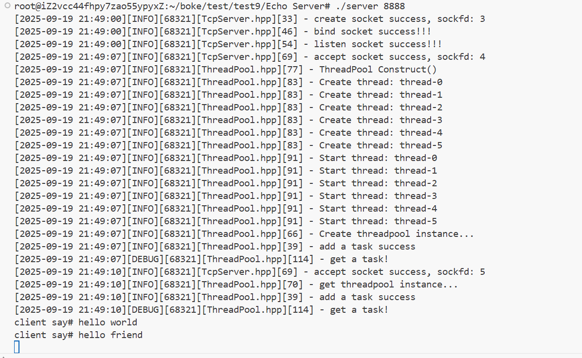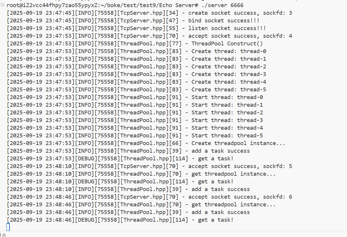 public:TcpServer(uint16_t port, int backlog = default_backlog):_port(port), _listenfd(default_listenfd), _backlog(default_backlog), _running(false){}void Init() {// 创建socket_listenfd = socket(AF_INET, SOCK_STREAM, 0);if(_listenfd < 0) {LOG(LogLevel::ERROR) << "create socket error, errno: " << errno << ", error string: " << strerror(errno);exit(Socket_Err);}LOG(LogLevel::INFO) << "create socket success, sockfd: " << _listenfd;// bindstruct sockaddr_in local;local.sin_addr.s_addr = INADDR_ANY;local.sin_family = AF_INET;local.sin_port = htons(_port);ssize_t n = bind(_listenfd, CONV(&local), sizeof(local));if(n < 0) {LOG(LogLevel::ERROR) << "socket bind error, errno: " << errno << ", error string: " << strerror(errno);exit(Bind_Err);}LOG(LogLevel::INFO) << "bind socket success!!!";// 设置 socket 为监听状态n = listen(_listenfd, _backlog);if(n < 0) {LOG(LogLevel::ERROR) << "listen socket error, errno: " << errno << ", error string: " << strerror(errno);exit(Listen_Err);}LOG(LogLevel::INFO) << "listen socket success!!!";}void Start() {using task_t = std::function<void()>;_running = true;while(_running) {// 获取连接struct sockaddr_in peer;socklen_t len = sizeof(peer);int sockfd = accept(_listenfd, CONV(&peer), &len);if(sockfd < 0) {LOG(LogLevel::WARNING) << "accept socket error, errno: " << errno << ", error string: " << strerror(errno);continue;}LOG(LogLevel::INFO) << "accept socket success, sockfd: " << sockfd;task_t t = std::bind(&TcpServer::Server, sockfd);ThreadPool<task_t>::GetInstance()->Push(t);}}static void Server(int sockfd) {char buffer[4096];// 一直进行IO操作while(true) {// 可以使用文件的读写接口直接进行通信ssize_t n = read(sockfd, buffer, sizeof(buffer) - 1);if(n > 0) {buffer[n] = 0;std::cout << "client say# " << buffer << std::endl;std::string echo = "server echo# ";echo += buffer;write(sockfd, echo.c_str(), echo.size());}else if(n == 0) { // 说明读到结尾,关闭连接LOG(LogLevel::INFO) << "client quit...";break;}else { // 文件读取出现错误LOG(LogLevel::ERROR) << "read sockfd error, errno: " << errno << ", error string: " << strerror(errno);break;}}}